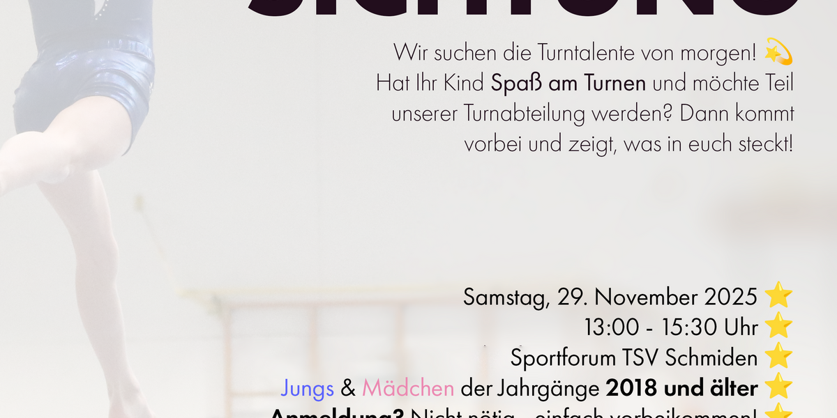 Das Sichtungstraining richtet sich an Jungs & Mädchen der Jahrgänge 2018 und älter, die Interesse daran haben, Teil unserer Turnabteilung zu werden. Es ist keine Anmeldung erforderlich – kommen Sie einfach vorbei!
