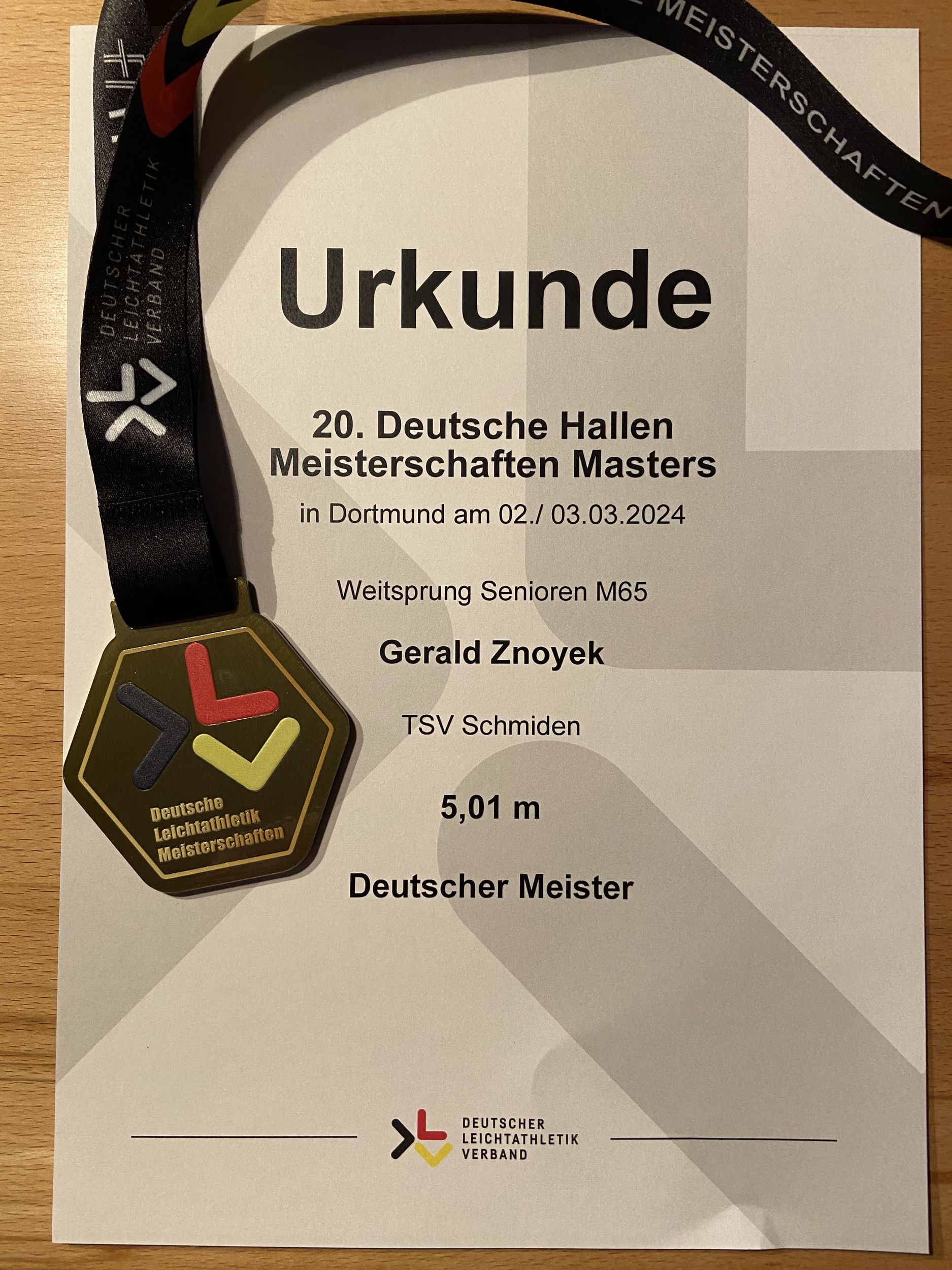 Nach dem Gewinn der Bronzemedaille bei den Senioren-Weltmeisterschaften 2023 in der Halle konnte Gerald Znoyek seine Lieblingsdisziplin Stabhochsprung nicht mehr ausüben, da er sich eine Sehne in der rechten Schulter angerissen hatte. Da der Heilungsprozess länger als erwartet dauerte, entschloss er sich Anfang des letzten Sommers, es mal im Weitsprung zu versuchen. Nach einem 6. Platz bei den Deutschen Seniorenmeisterschaften und einem 8. Platz bei den Senioren-Europameisterschaften wurde dann im Winter 2023/2024 öfter an der Weitsprungtechnik gefeilt.
