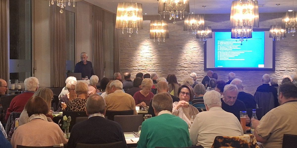 Kulinarisch verwöhnt wurden die Anwesenden selbstverständlich wie immer mit leckerem Essen und Getränken von der Familie Porro. Für alle Teilnehmenden war das diesjährige Herbstessen wieder einmal ein sehr kurzweiliger und geselliger Abend bei guter Stimmung und unterhaltsamen Gesprächen. Auf die musikalische Untermalung musste an diesem Abend leider verzichtet werden. Lange Jahre hat Dr. Roland Jäger an dieser Stelle immer tatkräftig unterstützt. Leider ist er im Mai dieses Jahres verstorben, und wir haben für ihn noch keinen adäquaten Ersatz gefunden.