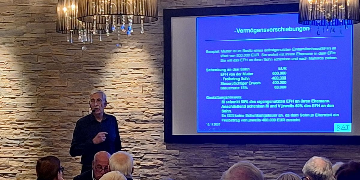 Nachdem die Beiratsvorsitzende Andrea Palm im Rahmen ihrer Begrüßung einen kurzen Überblick über die diesjährigen Aktivitäten gab, informierte anschließend unser Vereinspräsident Ulrich Lenk über den aktuellen Stand beim TSV Schmiden. Als Hauptredner war unser Kuratoriumsmitglied Prof. Dr. Helmut Rieker von Rieker Audit Tax, Wirtschaftsprüfer und Steuerberater, eingeladen. Mit großem Interesse lauschten die Anwesenden seinen sehr informativen Ausführungen über erbschafts- und schenkungssteuerliche Aspekte, über die auch im Nachgang noch angeregt diskutiert wurde.