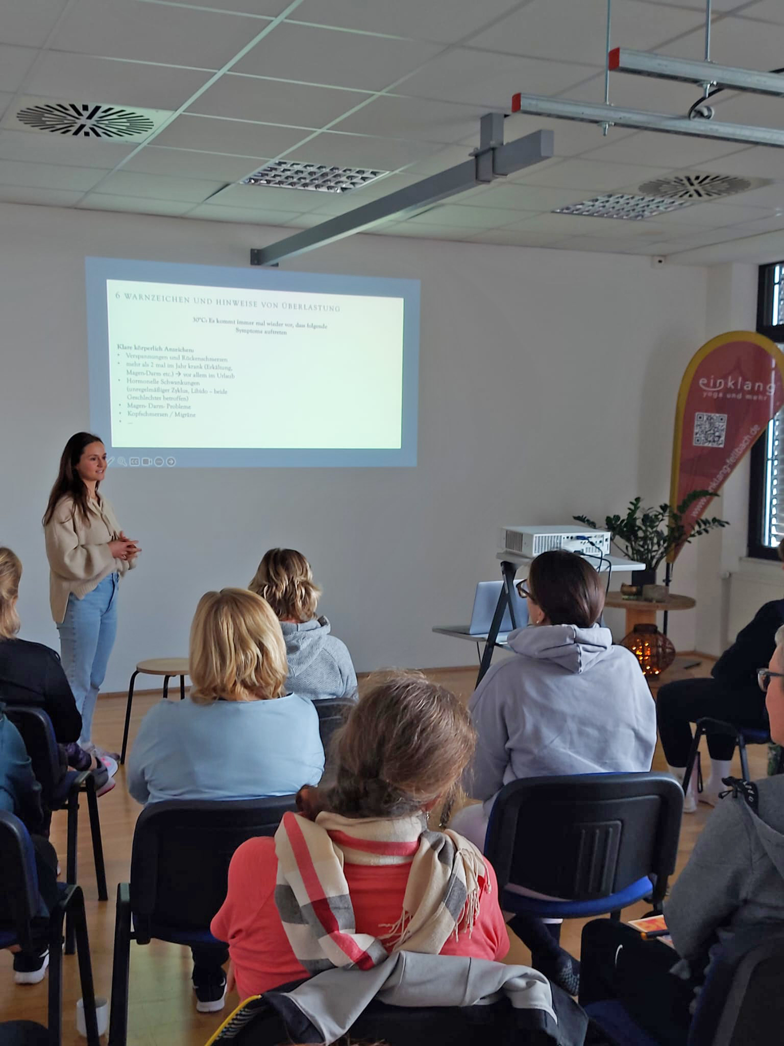 Unsere Expertin für körperorientiertes Stressmanagement, Gina Friedrich, hat einen Vortrag darüber gehalten und uns nützliche Übungen mitgebracht, die den Stressabbau unterstützen.