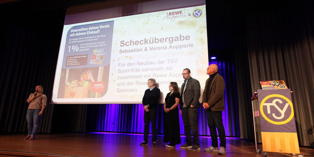 Zum Auftakt überreichte die Familie Aupperle im Rahmen der Rewe-Vereinskarte einen Spendenscheck zugunsten des geplanten Neubaus der TSV-Sport-Kita und erläuterte dabei das Konzept und die Beweggründe hinter dieser besonderen Vereinskarte.